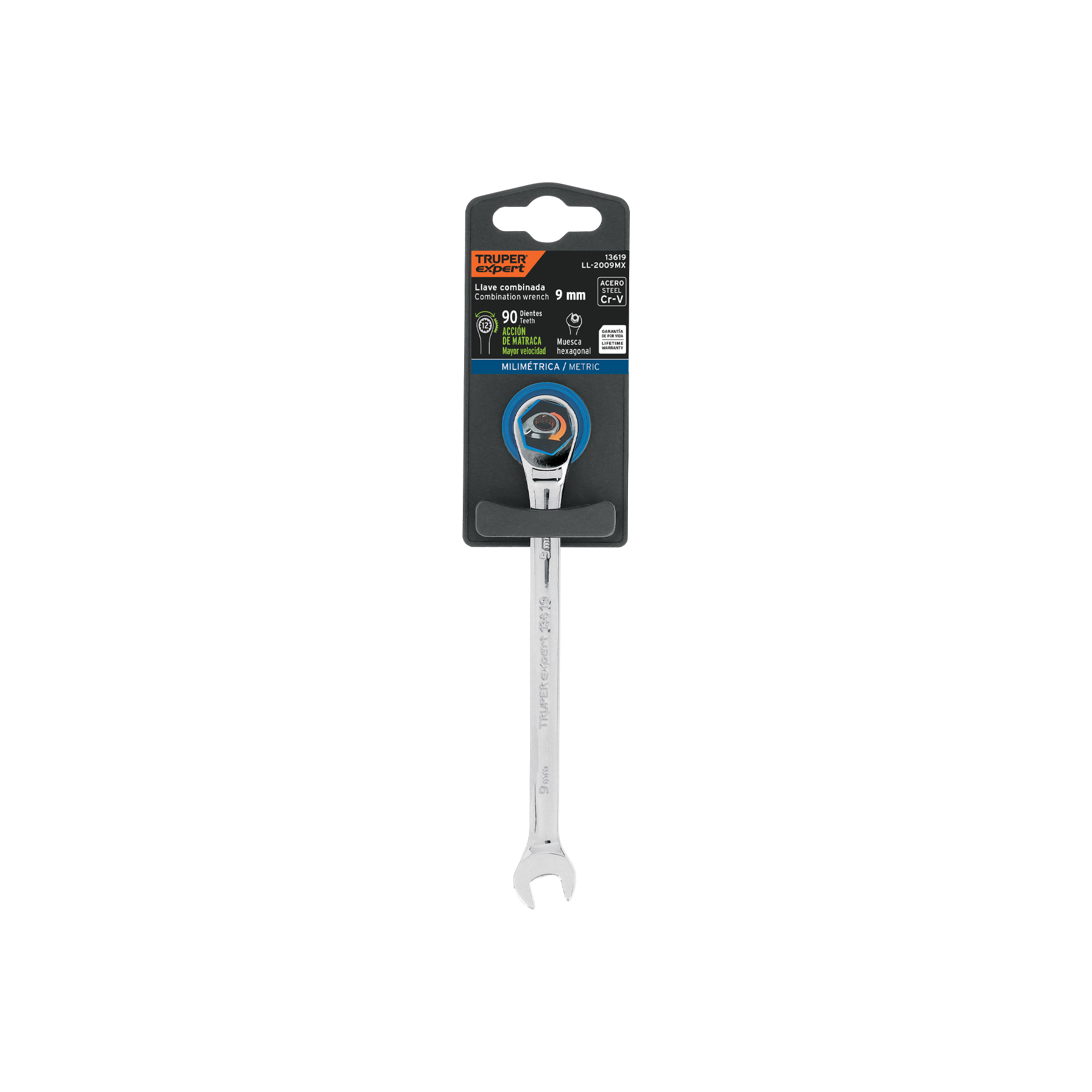 • Mecanismo de 90 dientes que permite apretar o aflojar con un movimiento mínimo en áreas estrechas